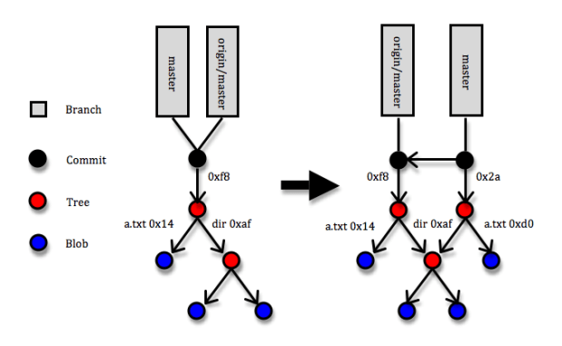 The diagram above shows a simplified picture of a Git repository where a commit is added. The root of the repository is a folder with a file called ‘a.txt’ and a directory called ‘dir’. Under the directory there’s a couple more files. In the commit, the a.txt file is changed. This means that three new entities are created: the new version of a.txt (hash code 0xd0), the new version of the root directory (hash code 0x2a), and the commit itself. Note that the new root directory still points to the old version of the ‘dir’ directory and that none of the objects that describe the previous version of the root directory are affect in any way.