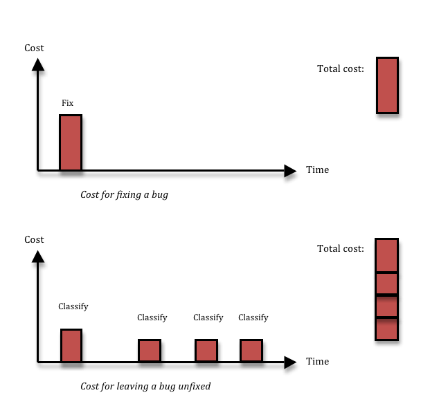 The solution I advocate is simple: don’t waste time talking about bugs, just fix them. The majority of bugs can be fixed in 1-5 hours (depending of course on the quality of your code structure). Just having a bug prioritisation process will almost certainly take 1-3 man-hours per bug, since it involves many people and these people need to find the time to talk together so that they all understand enough about the problem. The cost might be even larger if you take context switching and stall times due to slow decision-making into account. And if you add the cost of having to deal with duplicate bugs over time, it’s very hard to argue that you will save anything by not fixing a bug. There are exceptions, of course. First, time is a factor; the decision not to fix will always be cost effective from a very short perspective, and always wasteful from a very long perspective. Second, the harder the bug is to fix, and the less likely it is to happen, the less likely is it that you’ll recover the up-front cost of fixing the bug by avoiding long-term costs due to the bug recurring. I think it should be up to the developer whose job it is to fix the bug to raise his hand if it looks likely to fit into the hard-to-fix-and-unlikely-to-happen category. My experience tells me that less than 5% of all bugs fit into this bucket – I just had a look at the last 40 bugs opened in my current project, and none of those belonged there. Anyway, for those bugs, you will need to make a more careful decision, so you need the cost of a prioritisation process. That means you can reduce the number of bugs you have to prioritise by a factor 20, or perhaps more. Lots less context-switching and administration in the short perspective, and lots less duplicated bug classification work in the longer perspective.