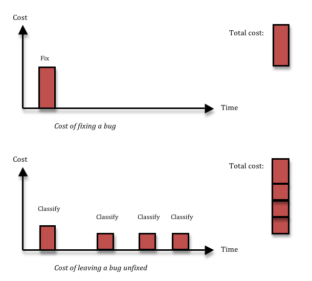 Note that the arguments I’m using are completely independent of the cost of the bug in terms of product quality. I’m just talking about development team productivity, not how end users react to the bug. I was in a discussion the other day with some former colleagues who were complaining that the people in charge of the business didn’t allow them to fix bugs. But the arguments they had been using were all in terms of product quality. That is something that (rightly, I think) tends to make business people suspicious. We as engineers want to make ‘good stuff’. Good quality code that we can be proud of. But the connection between our pride in our work and the company’s bottom line is very tenuous – not nonexistent, but weak. I want to be proud of what I do, and what’s more, I spend almost all of my time immersed in our technical solutions. This gives me a strong bias towards thinking that technical problems are important. A smart business person knows this and takes this into account when weighing any statement I make. But to me, the best argument in favour of fixing almost all bugs without a bug prioritisation process only looks at the team’s productivity. You don’t need the product quality aspect, although product quality and end-user experience is of course an additional reason to fix virtually all bugs.