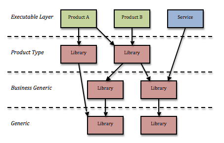 I’ve found that a lot of the time, code sharing isn’t planned, but emerges. You start with one product, and then there is an opportunity to create a new product that is similar to the first, so you build it on parts of the first. This means that you normally haven’t got a carefully planned set of libraries with well-defined and thought out dependencies between each other and can give rise to some problems: